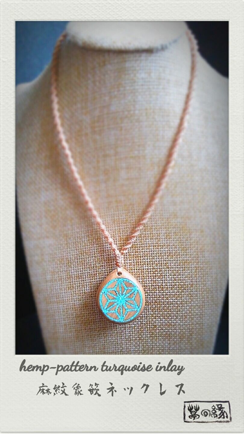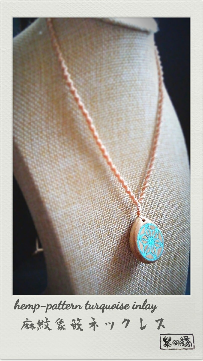 オリーブの特徴的な木目に細かく砕いたターコイズの天然石を日本伝統紋様の麻柄の形に象篏細工(埋め込み)を施しております。