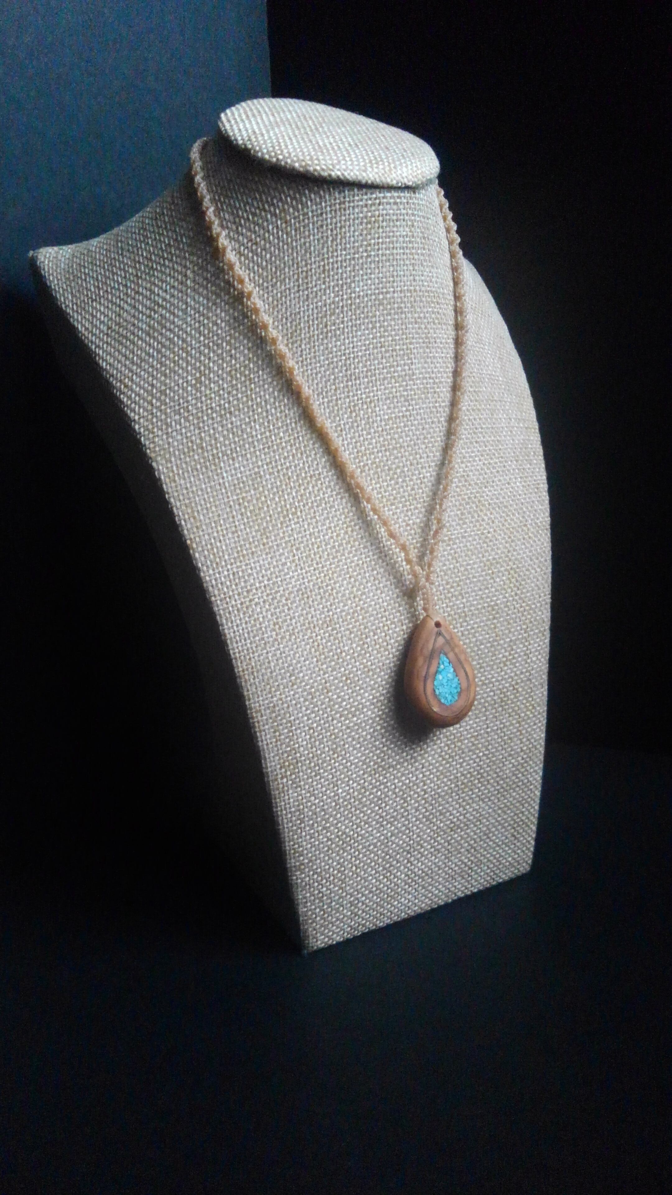 雫の形に削り出したオリーブの木材の中に、真鍮と細かく砕いたターコイズを埋め込んであります。
